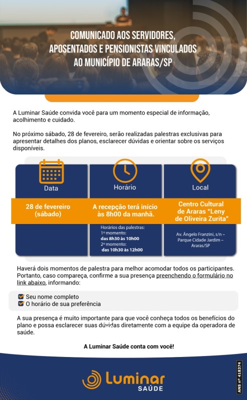 Visando esclarecer dúvidas e orientar os servidores públicos a respeito do novo plano de saúde que será implantado pela Prefeitura de Araras a partir do dia 16 de março, a Luminar Saúde irá promover palestras no Centro Cultural “Leny de Oliveira Zurita”, neste sábado (28), em dois horários: das 8h30 às 10h, e das 10h30 às 12h. A recepção aos funcionários começa às 8h.