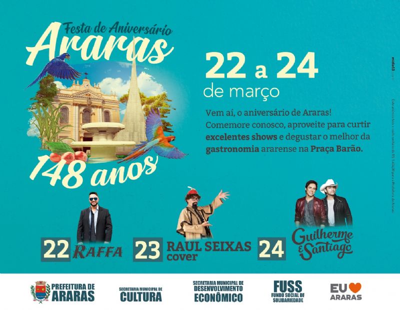 Outras informações sobre a “Festa Aniversário Araras – 148 anos” podem obtidas pelos telefones (19) 3541-5763 ou 3542-5807.
