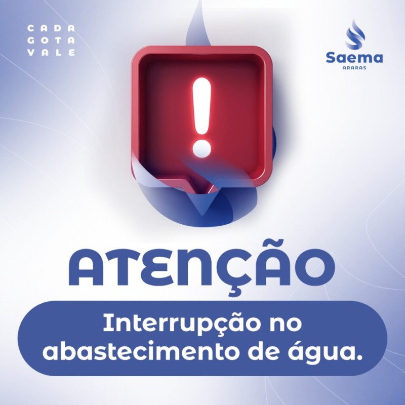 O Saema (Serviço de Água e Esgoto do Município de Araras) informa que uma manutenção emergencial pode causar falta de água nos bairros Jardim Rollo, São Benedito e proximidades. O serviço tem o objetivo de impedir um vazamento na tubulação próxima da Rua Padre Casemiro e não tem previsão para término.