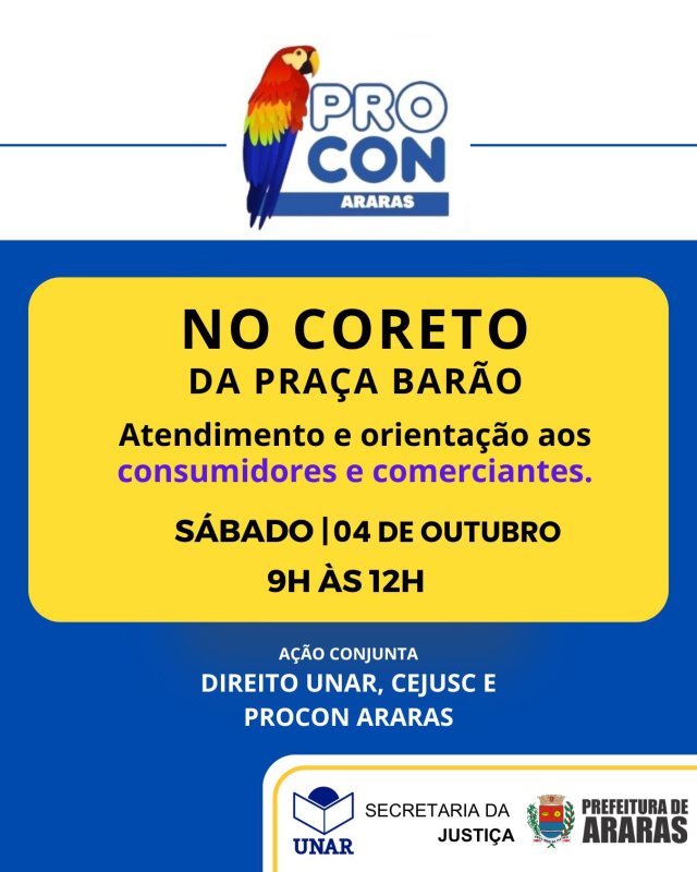 Neste sábado (4), das 9h às 12h, no Coreto da Praça Barão, o Procon (Fundação de Proteção e Defesa do Consumidor) de Araras e o Unar (Centro Universitário Dr. Edmundo Ulson), realizam a 5ª edição deste ano do “Procon na Praça”, com atendimento e orientação aos consumidores e comerciantes locais; a iniciativa tem o apoio da Prefeitura de Araras, por meio da Secretaria Municipal da Justiça.