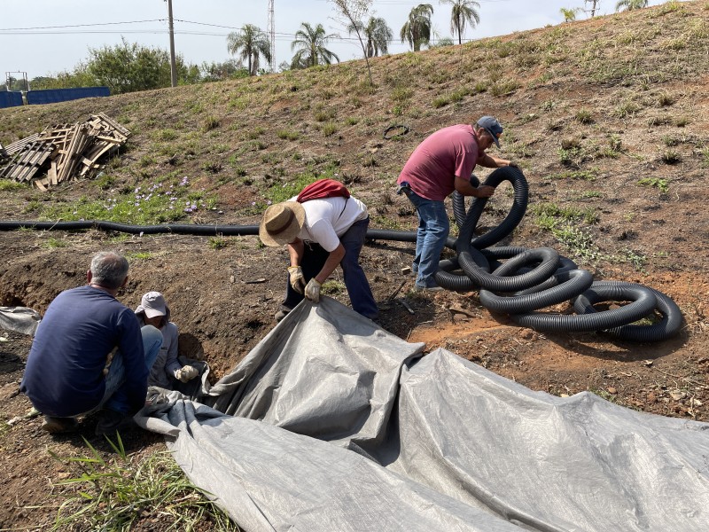 O sistema de drenagem conta com manta bidim e aproximadamente 150 metros de tubulação, levando a água da chuva até uma boca-de-lobo, evitando que se acumule e invada a via.