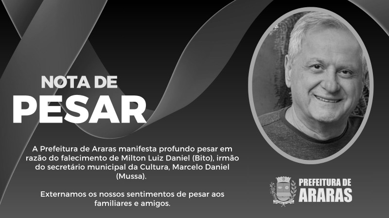 A Prefeitura de Araras manifesta profundo pesar pelo falecimento de Milton Daniel, aos 65 anos, nesta terça-feira (28). Conhecido carinhosamente como Bito, ele era irmão do secretário municipal de Cultura, Marcelo Daniel (Mussa). Ele deixa a esposa Rosa, as filhas Mariana e Marcela, e as netas Helena e Heloísa.