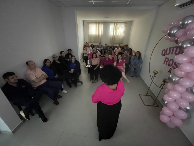 Encerrando o “Outubro Rosa”, mês de conscientização e prevenção do câncer de mama, os profissionais do Ganha Tempo e do atendimento ao público do Saema, que trabalham no mesmo espaço, participaram de uma palestra sobre o assunto, com o relato de Eliete Cândido, servidora pública que já passou pelo tratamento contra a doença.