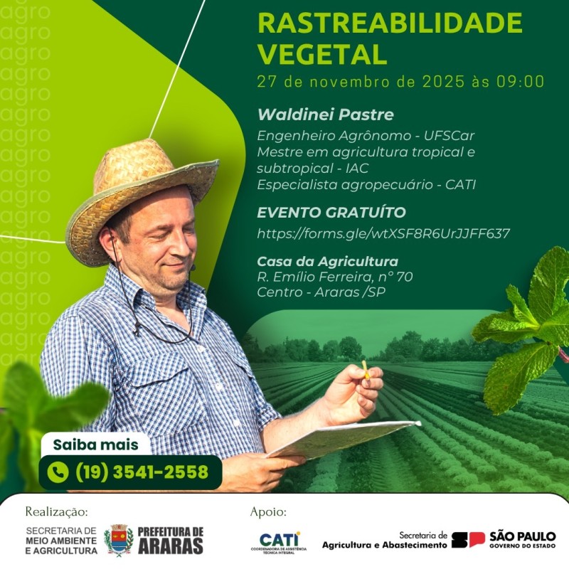 Nesta quinta-feira (27), a Secretaria Municipal de Meio Ambiente e Agricultura irá promover um evento sobre rastreabilidade vegetal. O tema será abordado e discutido às 9h, na Casa da Agricultura, localizada na Rua Emílio Ferreira, nº 70, no Centro; o cadastro está disponível aqui.