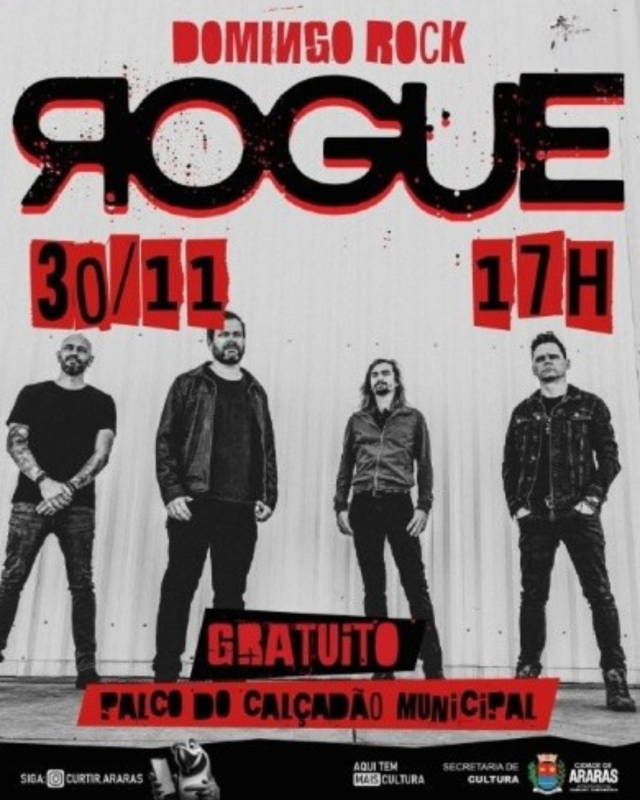 Fechando a programação cultural de novembro, a banda de rock Rogue se apresenta neste domingo (30), às 17h, no palco Vitor Felippe – “Vitão”, no Calçadão “Monsenhor Quércia”; o show faz parte do projeto “Vitrola Rock”.