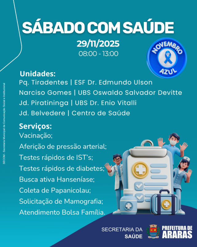 A Secretaria Municipal da Saúde de Araras realiza neste sábado (29) mais uma edição do “Sábado com Saúde”. A ação acontece das 8h às 13h, em quatro unidades básicas localizadas nos bairros Parque Tiradentes, Narciso Gomes, Piratininga e Belvedere.