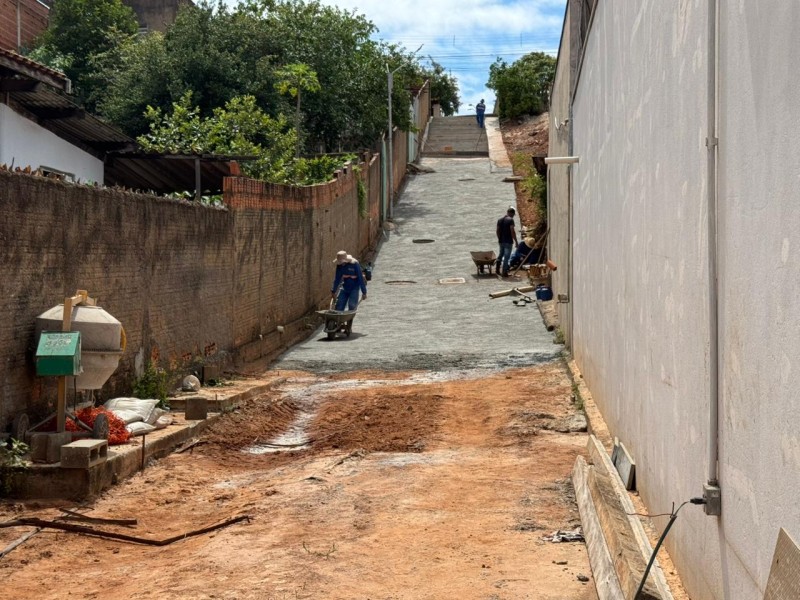A obra de infraestrutura de drenagem na viela entre as ruas Ribeirão Preto e Sorocaba, no Jardim São João, está em fase final, com a construção das escadas e instalação do muro ala, que ajuda a segurar a pressão da água.