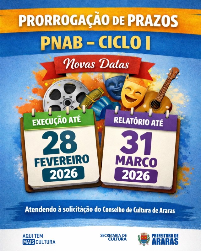 A Secretaria Municipal de Cultura de Araras informa que foram prorrogados os prazos da PNAB (Política Nacional Aldir Blanc de Fomento à Cultura) – Ciclo I, ampliando o período destinado à execução dos projetos contemplados e à entrega da documentação final.