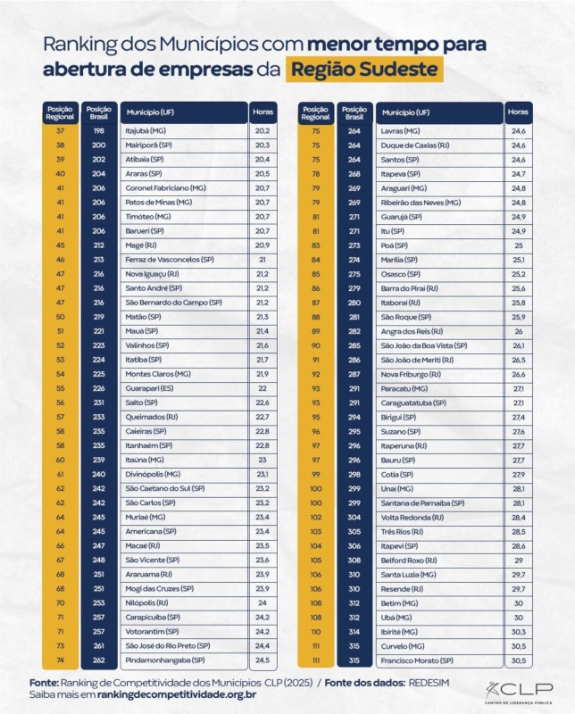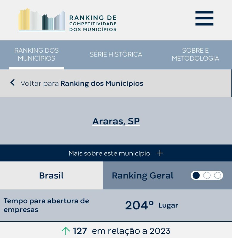 O município de Araras alcançou a 204ª colocação entre as 5.569 cidades brasileiras segundo o Ranking de Competitividade dos Municípios, elaborado pelo Centro de Liderança Pública (CLP), que avaliou o ano de 2025. O destaque foi o indicador relacionado ao tempo de abertura de empresas.