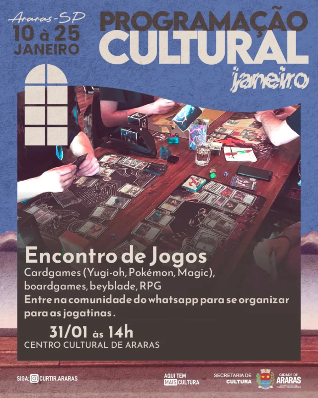 No sábado (31), às 14h, tem mais um Encontro de Jogos no Centro Cultural Leny de Oliveira Zurita, com jogos de tabuleiro e de cartas, beyblade e RPG. Quem quiser se organizar nos grupos para jogar pode entrar na comunidade do WhatsApp. O link está disponível nos destaques do Instagram.