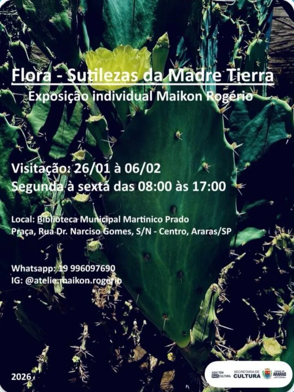 Além disso, a exposição “Flora – sutilezas de Madre Tierra” recebe os visitantes até o dia 06 de fevereiro na Biblioteca Municipal Martinico Prado, de segunda a sexta-feira, das 8h às 17h.
