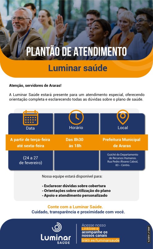 A Luminar Saúde realiza um plantão de atendimento aos servidores públicos municipais de terça (24) a sexta-feira (27), das 8h30 às 18h, no guichê do Departamento de Recursos Humanos da Prefeitura de Araras, que fica Rua Pedro Álvares Cabral, 83, Centro. A ação tem o objetivo de orientar os conveniados e esclarecer dúvidas sobre o plano de saúde. A Luminar também tem canais digitais de atendimento que estão disponíveis em www.linktr.ee/luminarsaude.