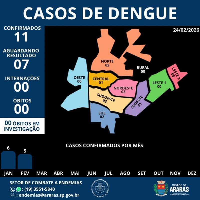 Segundo o boletim epidemiológico desta terça-feira (24) são 11 casos confirmados de dengue em Araras em 2026 e sete pessoas estão aguardando resultado. Não há internações ou óbitos. Caso apresente sintomas como febre, dor de cabeça, dor no corpo, dor atrás dos olhos, coceira, manchas no corpo, vômito e diarreia, procure o posto de saúde mais próximo de sua casa.
