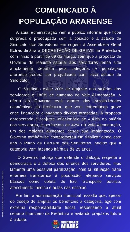 A atual administração vem a público informar que ficou surpresa e preocupada com a posição e a atitude do Sindicato dos Servidores em sugerir à Assembleia Geral Extraordinária a DECRETAÇÃO DE GREVE na Prefeitura, com início a partir de 09 de março, sem que a proposta do Governo de reajuste salarial aos servidores tenha sido amplamente debatida pela categoria. A população ararense poderá ser prejudicada com essa atitude do Sindicato.