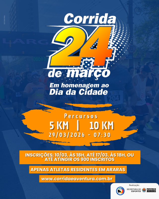 Com 900 vagas a serem preenchidas, as inscrições da “Corrida 24 de Março” 2026 começam nesta terça-feira (10), a partir das 18h, no site www.corridaeaventura.com.br.