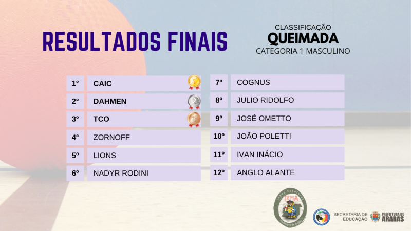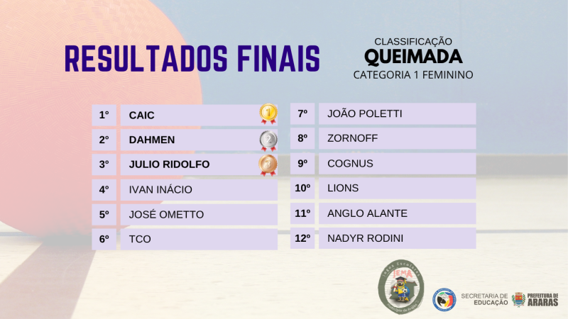 Tanto na categoria feminina quanto na masculina da queimada, o CAIC venceu a Emef Antonia Marques Dahmen por 8 a 0 e 6 a 0, respectivamente. Assim, a classificação final ficou da seguinte forma: