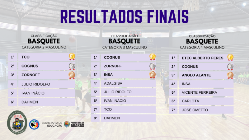 Já no basquete masculino, o TCO venceu o Cognus por 18 a 11 e sagrou-se campeão na categoria 2. O terceiro lugar ficou para a Emef Prof. Leonaldo Zornoff, que ganhou da equipe da Emef Prof. Júlio Ridolfo, por 8 a 4.