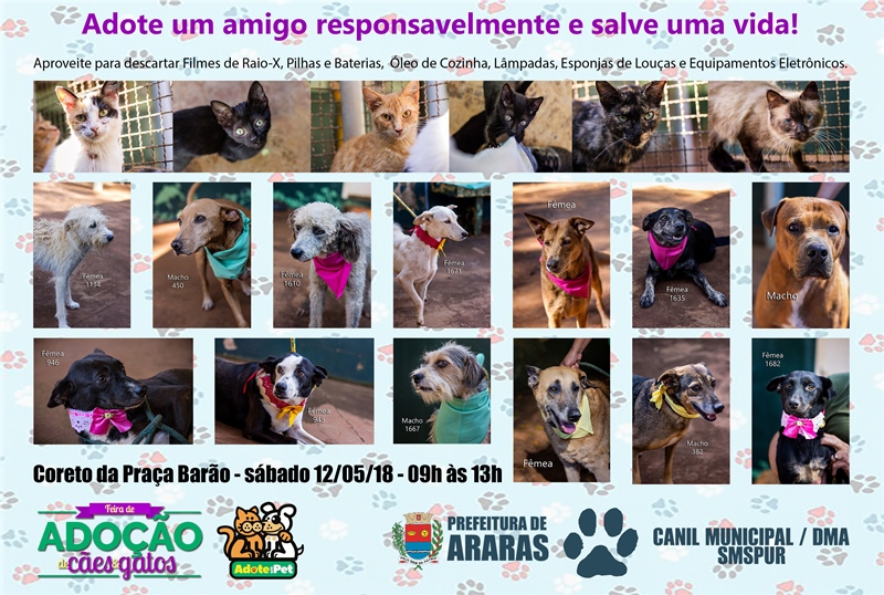 Tudo o que eles precisam é de proteção, carinho e cuidados. Por isso, neste sábado (12), das 9h às 13h, a Prefeitura de Araras realiza a 3ª edição da Feira de Adoção de Cães e Gatos, na Praça Barão de Araras, no Centro. A organização é da Secretaria Municipal de Serviços Públicos, Urbanos e Rurais, por meio do DMA (Departamento de Meio Ambiente).