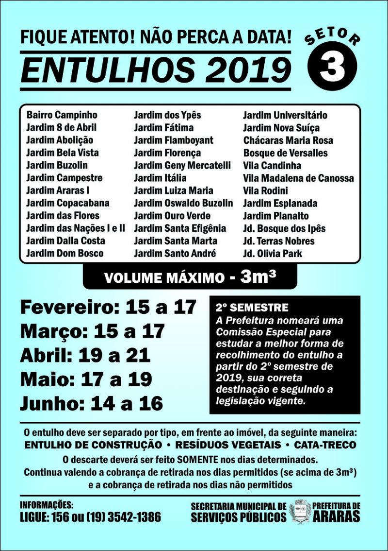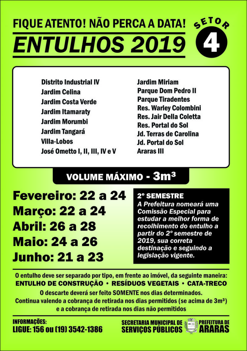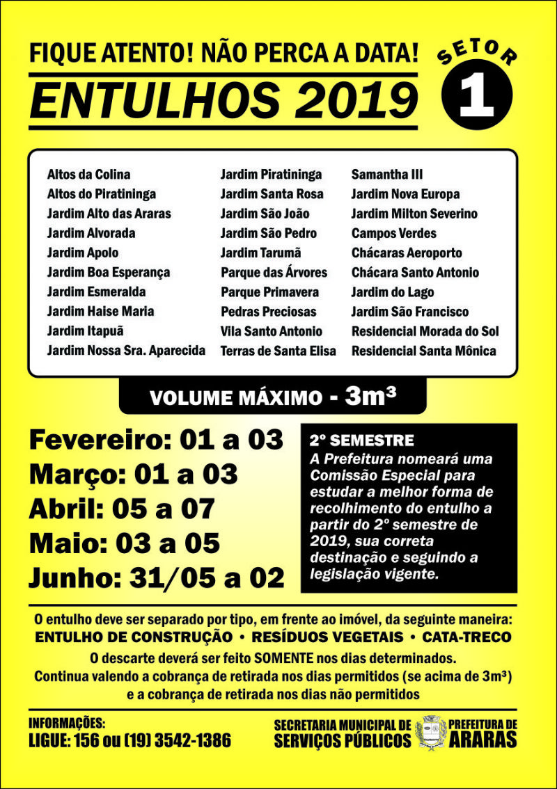 Os bairros do Setor 1 poderão colocar o entulho nas ruas de 1 a 3 de fevereiro; os do Setor 2, o entulho pode ser colocado nas ruas de 8 a 10 de fevereiro; o Setor 3 prevê a colocação de entulho nas ruas de 15 a 17 de fevereiro; e os moradores dos bairros do Setor 4 podem colocar o entulho nas ruas de 22 a 24 de fevereiro. O cronograma já definido segue até o mês de junho.