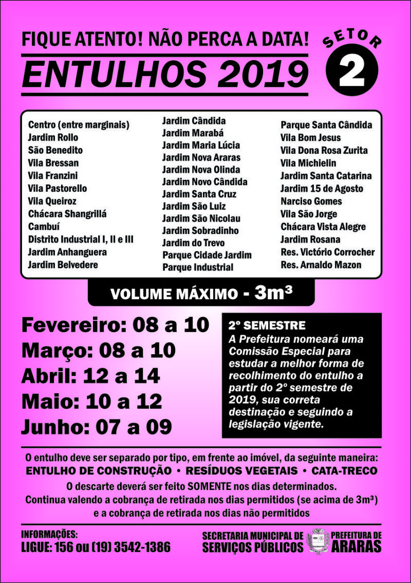 O Decreto nº 6.440/2018 proíbe a colocação de entulho até dia 31 de janeiro, portanto, quem colocou entulho antes deste prazo está sendo notificado e o eventual serviço executado pela Prefeitura será cobrado, conforme prevê a legislação. O mesmo ocorrerá com quem colocar o entulho a partir de 1º de fevereiro fora do prazo de sua região.