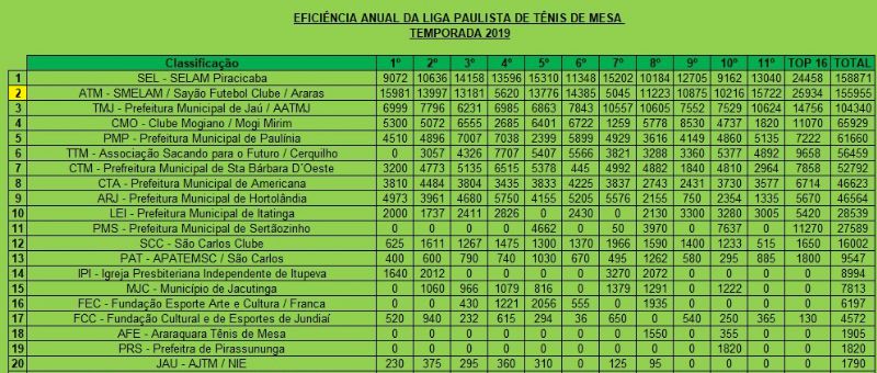 Araras faturou o vice-campeonato da Liga Paulista de Tênis de Mesa 2019 no último final de semana. A equipe formada por atletas da Secretaria Municipal de Esportes/Sayão FC fechou a competição regional com 155.955 pontos. O título ficou com a cidade de Piracicaba, que somou 158.871.
