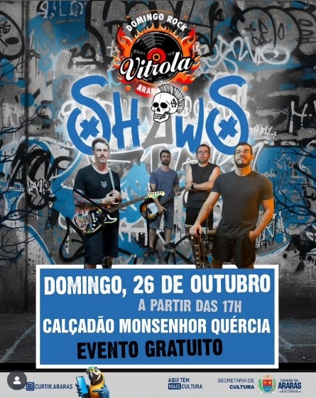 Neste fim de semana, a programação cultural, organizada pela Secretaria Municipal de Cultura, terá como destaque a show da Banda Shaws, que se apresenta no Calçadão “Monsenhor Quércia”, no domingo (26), às 17h; a apresentação de rock faz parte do projeto “Domingo Rock Vitrola”.