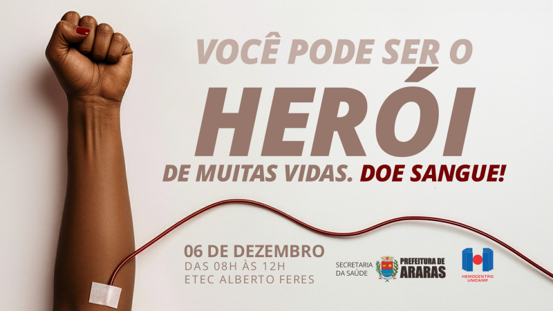 A Prefeitura de Araras, em parceria com o Hemocentro da Unicamp (Universidade Estadual de Campinas), realiza no próximo sábado (6) mais uma Campanha de Doação de Sangue. A ação acontece na ETEC Prefeito Alberto Feres, das 9h às 12h, e as senhas começam a ser distribuídas às 8h.