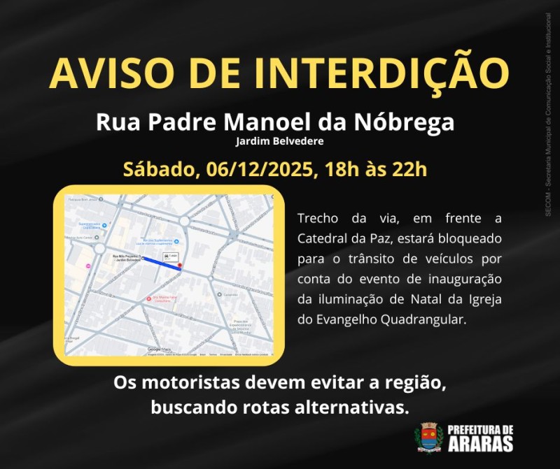 O Demutran (Departamento Municipal de Trânsito) de Araras informa que a rua Padre Manoel da Nóbrega, no Jardim Belvedere, estará parcialmente interditada para o tráfego de veículos na noite deste sábado (6). A interdição será entre os números 97 e 175, trecho em frente à Catedral da Paz, das 18h às 22h.