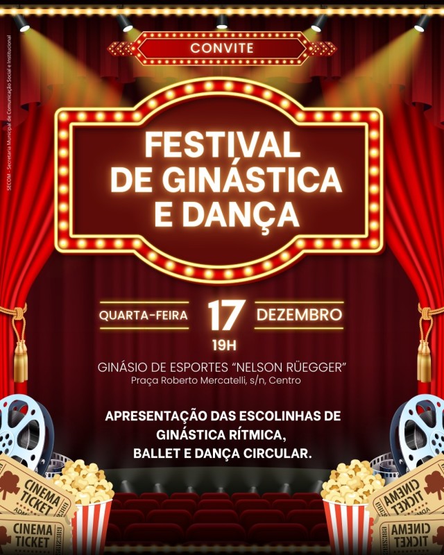 A Secretaria Municipal de Esportes irá promover nesta quarta-feira (17), o Festival de Ginástica Rítmica e Dança 2025. O evento será realizado no Ginásio “Nelson Rüegger”, a partir das 19h.