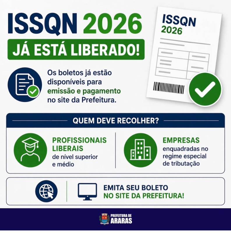 Já estão disponíveis para pagamento os boletos do ISSQN Fixo (Imposto Sobre Serviços de Qualquer Natureza) 2026. Os contribuintes devem fazer a emissão pelo site da Prefeitura, www.araras.sp.gov.br, no ícone “Serviços Digitais”, na página inicial do site, depois em “Serviços ao Cidadão”, seguindo pelos links “Tributação Fazenda” e “ISS Anual”.